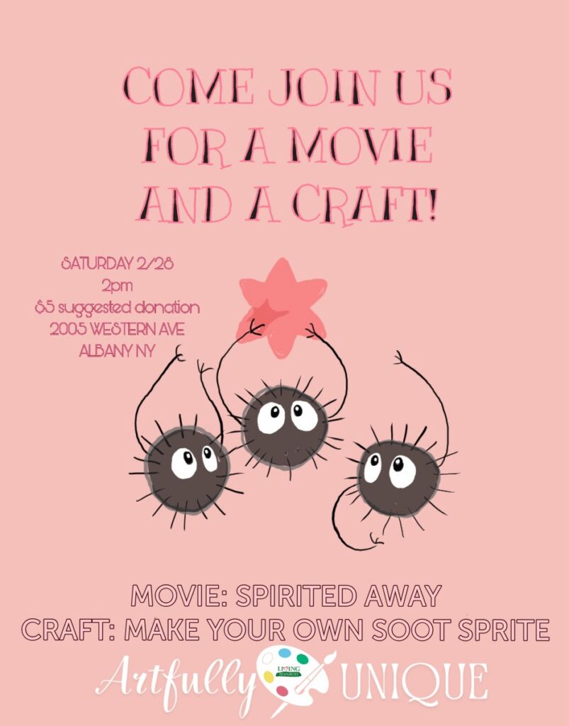 Join us in watching Spirited Away and making your our soot sprite ️️️️with art instructor Emma Rinaldi at the Artfully Unique Gallery!